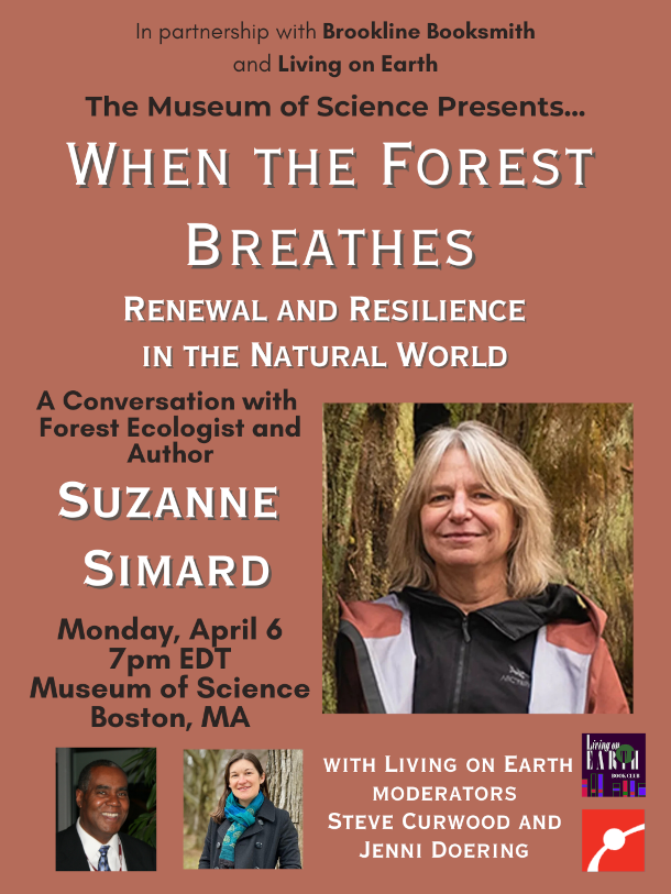 Presented by the Museum of Science, in collaboration with the Living on Earth Book Club and Brookline Booksmith, author and forest ecologist Suzanne Simard will talk about her new book When the Forest Breathes with moderators Steve Curwood and Jenni Doering.