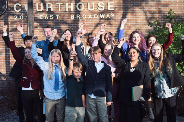 Youth plaintiffs outside the US District Court for Montana where the two-day hearing on Lighthiser v. Trump took place. Front row: Eva, Jasper, Nate, Jeff, Jorja, Miko, Delaney. Back row: Joseph, Isaiah, Charlotte, Georgi, Grace, Olivia, Taleah. (Photo: Our Children’s Trust, Eillin Delapaz)