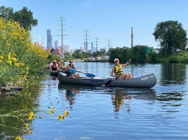 Friends of the Chicago River volunteers paddle in canoes on Bubbly Creek, picking up trash in 2022. (Photo: Friends of the Chicago River)