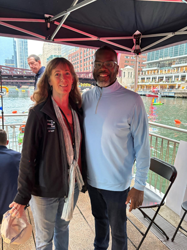 Friends of the Chicago River executive director Margaret Frisbie (left) with Chicago Mayor Brandon Johnson at the Chicago River Swim on September 21, 2025. (Photo: Courtesy of Margaret Frisbie)