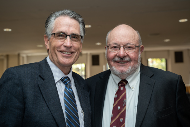 Arden Pope (left) and Doug Dockery (right) at a Harvard symposium in October 2022 to honor Doug, a former chair of the Department of Environmental Health at the Harvard T.H. Chan School of Public Health. The two pioneering researchers have spent four decades bringing the health effects of air pollution to the forefront of public health. (Photo: Steve Gilbert, Studioflex Productions.)