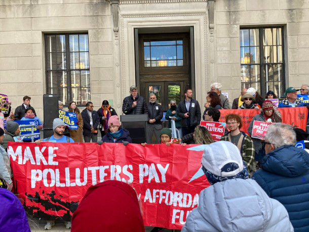 Bill McKibben speaks at the New Jersey Climate Superfund rally outside the Trenton Statehouse on November 17, 2025. This call to action supports legislation requiring major fossil fuel companies like Exxon, Shell, and BP to pay for damages from climate change impacts. (Photo: Alice Fruend)
