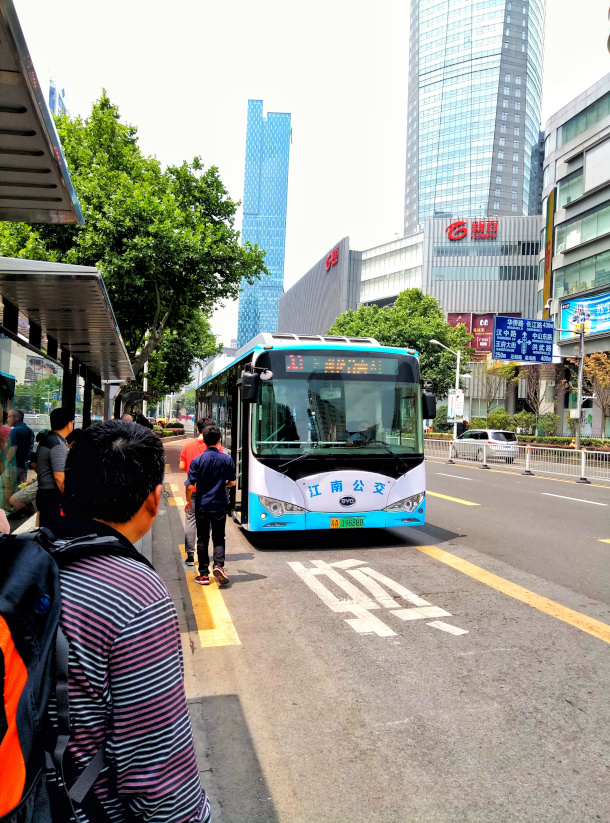 The rise of electric vehicles in China has made the air cleaner and the roads quieter, says McKibben. Above, an electric bus stops in the central business district of Nanjing, China. (Photo: DKMcLaren, Wikimedia Commons, CC BY-SA 4.0)