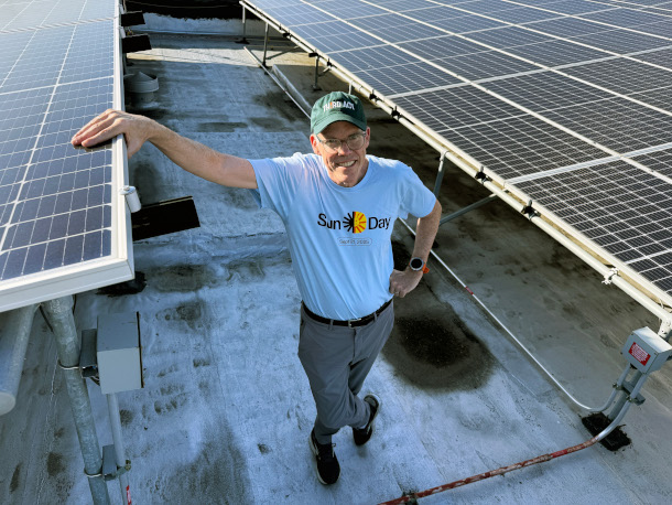 This year’s fall equinox, September 21, 2025 marked the first official Sun Day, a celebration of solar power and other forms of clean energy. This day of action marked over 500 events across the country including demonstrations, rallies, festivals, and faith-based events. Here, Bill McKibben poses with a solar power setup. (Photo: Simone Salvo)