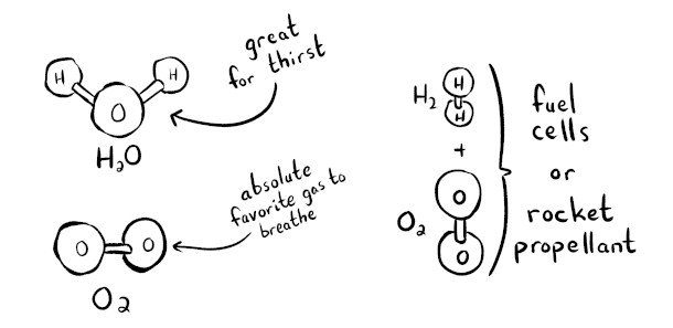 KELLY WEINERSMITH: Yeah, very dry concrete, yeah. And so if you want water on the moon, you have to go to the poles. And in the poles, there are these craters, and inside the craters there's water trapped as ice, and it's so cold that it's like rock, but it's still there, and it's contaminated. It'll need to get cleaned up, but there's water there. And those craters are also important because the rims of the craters would be great places to set up solar panels. So if you are at the equator, you have a period of time that's equivalent to two weeks here on Earth where you're in total darkness. So their nights are really long, and the number of battery packs that you would need to bring with you is prohibitive. So we're probably not going to be relying on solar power at the equator.