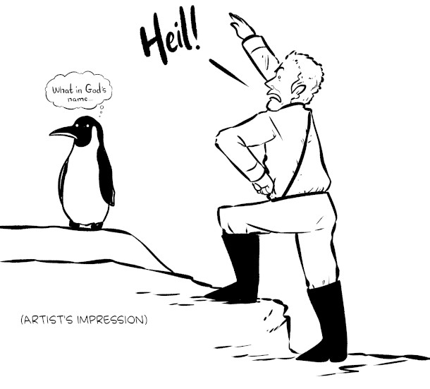 In the process of the Nazis trying to claim a chunk of Antarctica, they 'heil’ed a penguin. (Image: Drawn by Zach Weinersmith)