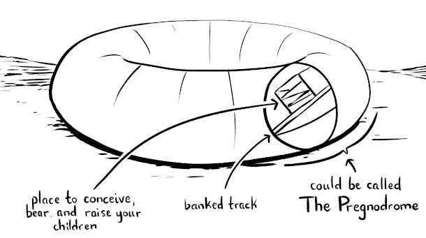 One proposed strategy for mimicking Earth gravity in the vacuum of space involves the use of something called a rotating wheel space station. (Image: Drawn by Zach Weinersmith)